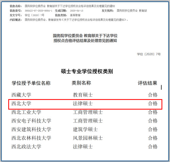 4月30日,国务院学位委员会、教育部发布了《关于下达学位授权点合格评估结果及处理意见的通知》(学位〔2020〕7号),历时六年的学位授权点合格评估结果正式揭晓。《通知》指出,此次共抽评普通高校和科研机构现有学位授权点2292个,评估结果分为“合格”“不合格”和“限期整改”。公司法律硕士专业学位授权点评估结果为“合格”。