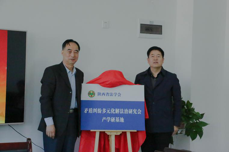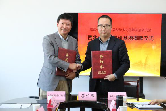 会上,陕西时代投资管理有限公司董事长曲非与经理王思锋共同签署校企全面合作协议,陕西省矛盾纠纷多元化解法治研究会董建良会长与党委书记李一凡共同为产学研基地揭牌。