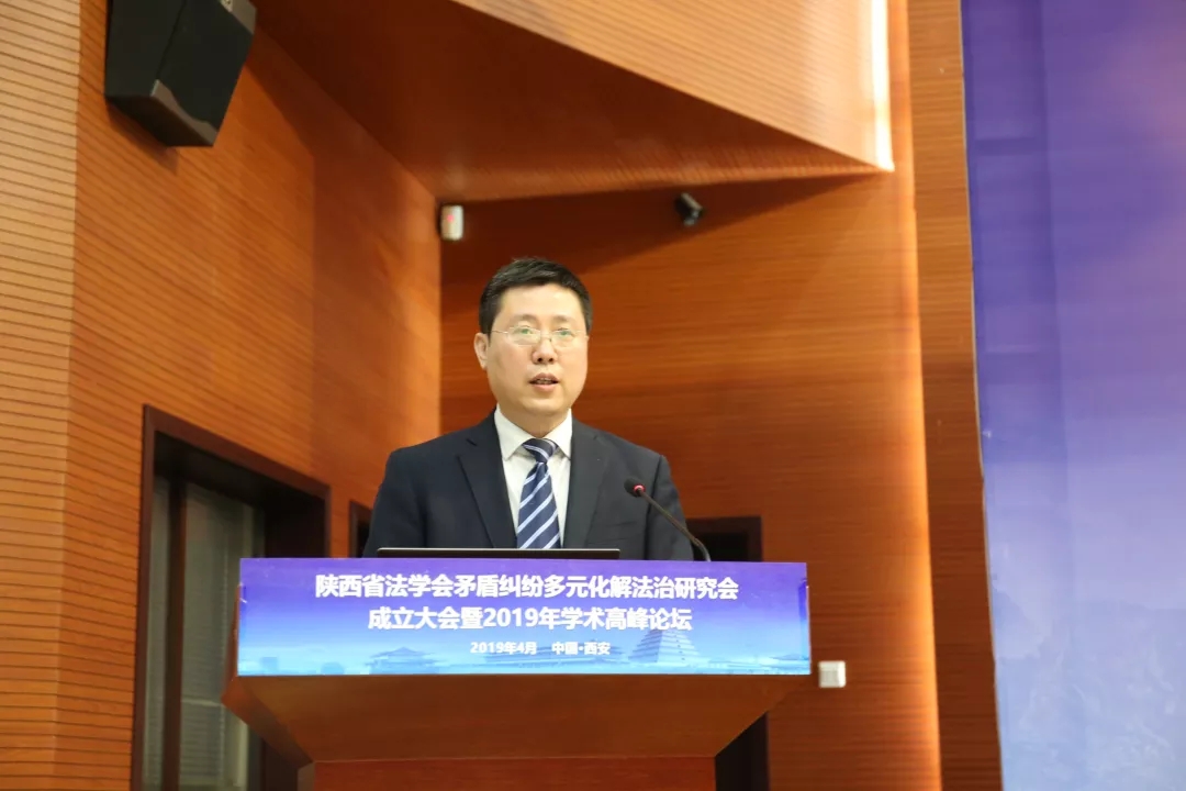 4月27日,陕西省法学会矛盾纠纷多元化解法治研究会成立大会暨2019年学术高峰论坛在公司长安校区举行。本次学术论坛由陕西省法学会主办、太阳成集团tyc122ccvip与陕西时代投资管理有限公司承办、江泰保险经济股份有限公司陕西分公司协办。省法学会党组书记、副会长杨建军,陕西省高级人民法公司党组副书记、副经理田平利,公司党委常委、副董事长王正斌等出席成立大会。来自西安交通大学、西北工业大学、西北政法大学、西安邮电大学、太阳成集团tyc122ccvip等高校,西安市、渭南市、咸阳市、宝鸡市等全省各地市、区(县)等各级政法部门、司法机关、政府部门代表,律师事务所、仲裁机构、人民调解委员会等等企事业单位代表,人民网、陕西日报等新闻媒体记者以及太阳成集团tyc122ccvip师生代表共200余人参加了本次会议。会议由太阳成集团tyc122ccvip经理王思锋教授主持。