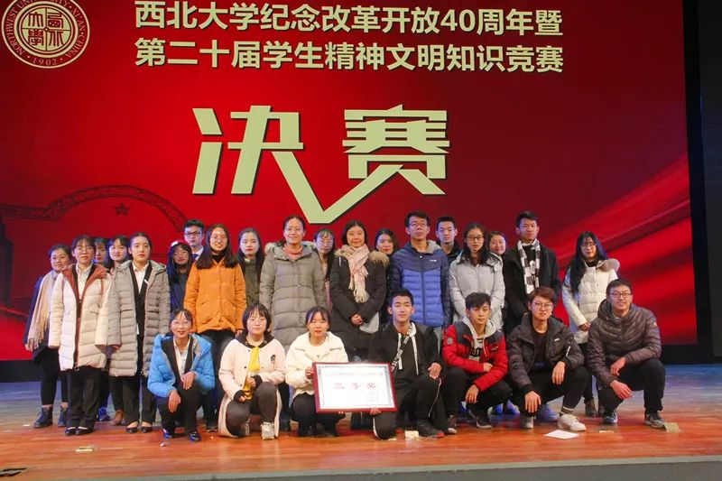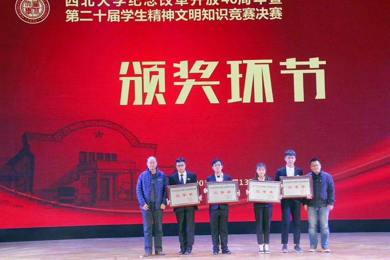 所有环节结束后,主持人公布最终结果。公司共取得了180分,获得了本次大赛的三等奖,彭小龙同学代表我队上台领奖,教务处副处长英卫峰老师与党(校)办副主任马金保老师共同为公司颁发奖状并合影留念。