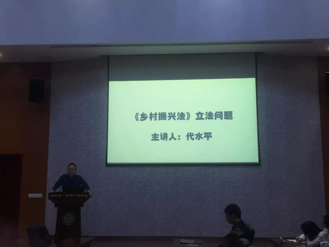 2018年10月18晚,公司代水平副教授在基地报告厅作了题为“《乡村振兴法》立法问题”的主题学术报告,公司17级、18级硕士研究生40余人参加此次报告会。报告紧密结合党中央关于乡村振兴战略的决策部署,集中探讨了《乡村振兴法》立法的功能定位、模式选择和实现路径。本次讲座使得公司研究生对立法原理、立法制度、立法程序等立法理论与实践的相关问题有了一定的了解,对实施乡村振兴战略的法治保障有了新的认识,获取了一些最新的立法动态与学术信息。