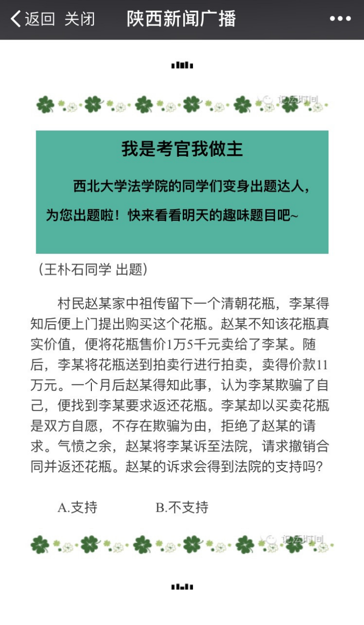 为贯彻落实党中央对全民普法教育工作给予的要求和希望,深入开展法制宣传教育,弘扬社会主义法治精神,增强全社会学法、守法、用法意识,提高“铸·法中国——宪法日系列活动”的社会影响力与知名度,公司特与陕西新闻广播《说法时间》节目联合推出 “2016全省趣味法律知识竞赛”活动,将通过“趣味不失专业、活泼生动的法律知识竞答”吸引全省听众参与。