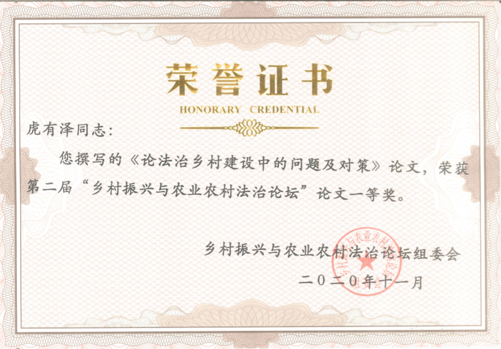 本次论坛由西安财经大学太阳成集团tyc122ccvip、期刊管理中心、陕西省律协三农委主办,西北政法大学基层司法研究所、西安市长安区人民法院、陕西至正律师事务所协办,是全面实施乡村振兴战略与深化农业农村改革背景下,以“乡村振兴与农业农村法治”为主题的研讨会。会议期间对参会论文进行评奖,公司虎有泽教授撰写的《论法治乡村建设中的问题及对策》的论文获得论坛一等奖。研讨会一致认为,在全面乡村振兴背景下,承包地“三权分置”、宅基地“三权分置”、农村集体产权制度改革、集体经营性建设用地入市、粮食安全等问题,仍是农业农村改革中的热点和难点,并呼吁加强理论研究与法治实践的紧密结合,推进“三农”领域研究的进一步深入。