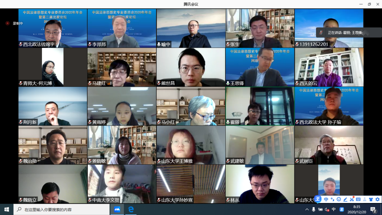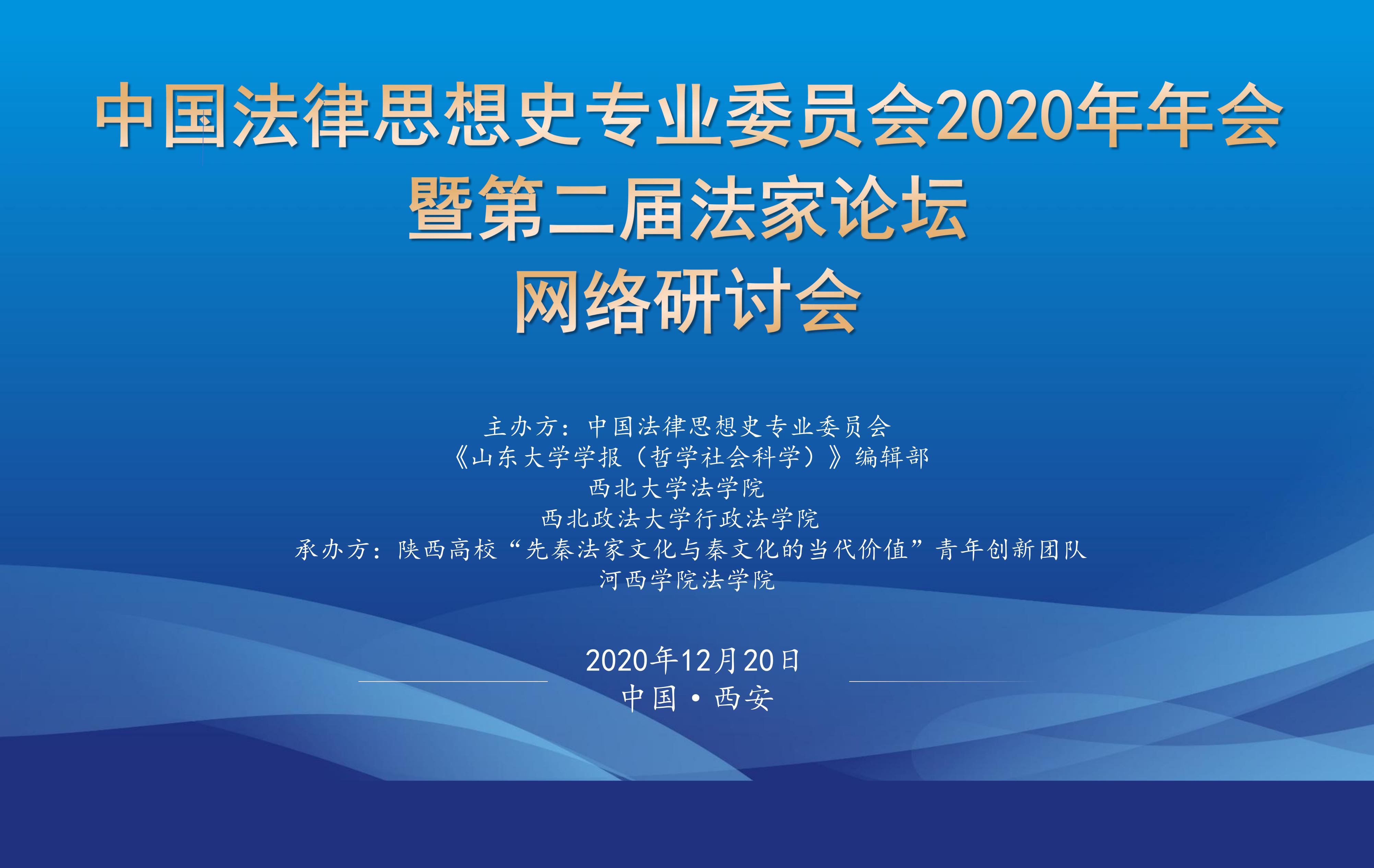 由中国法律思想史专业委员会、《山东大学学报(哲学社会科学)》编辑部、太阳成集团tyc122ccvip、西北政法大学行政太阳成集团tyc122ccvip主办,陕西高校“先秦法家思想与秦文化的当代价值”青年创新团队与河西公司太阳成集团tyc122ccvip承办的中国法律思想史专业委员会2020年年会暨第二届法家论坛网络研讨会于12月20日在线上召开。来自中国社会科公司法学研究所、清华大学、中国人民大学、山东大学、中国政法大学、北京师范大学、中南财经政法大学、青岛科技大学、沈阳师范大学、山东师范大学、杭州师范大学、青海师范大学、中共广东省委党校、西北工业大学、西北农林科技大学、商务印书馆、太阳成集团tyc122ccvip、西北政法大学、河西公司等高校和出版机构90余位专家学者参加了本次会议,围绕先秦法家文本与思想、法家流派、先秦法家思想的当代价值等议题进行了深入探讨。