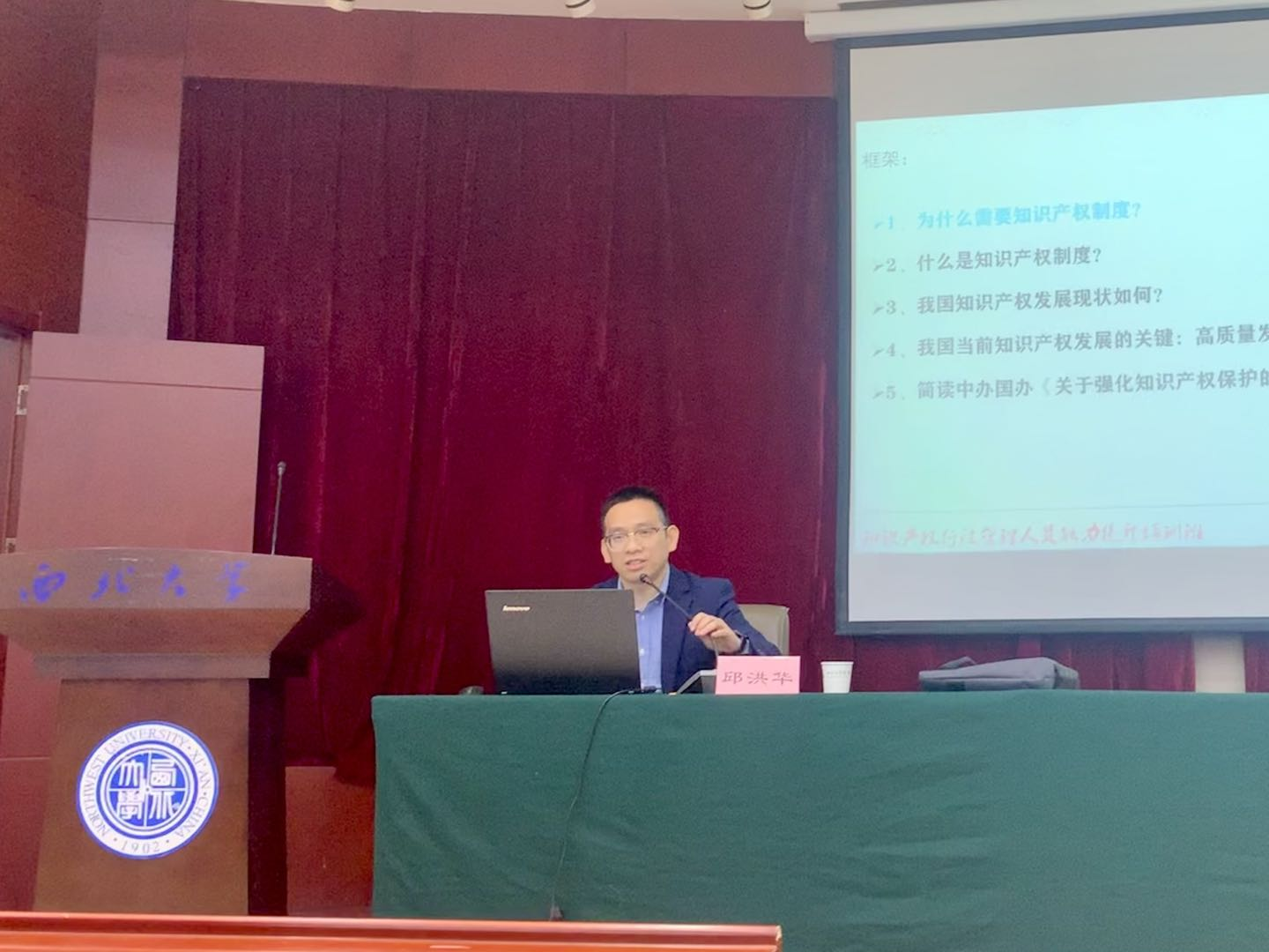 2021年3月18日上午,开班仪式结束后,太阳成集团tyc122ccvip知识产权公司邱洪华教授为培训班主讲第一场专题报告,主题为《知识产权基础知识》。邱洪华教授先是阐述了为什么需要知识产权制度,然后系统、全面、深入和专业地从概念特征、具体内容、取得程序、保护范围和国际保护等方面,对专利、商标、著作权和商业秘密等知识产权具体类型进行了深入浅出地讲授,使得与会学员对于知识产权基础知识有了更准确、全面和深入地认识和理解。