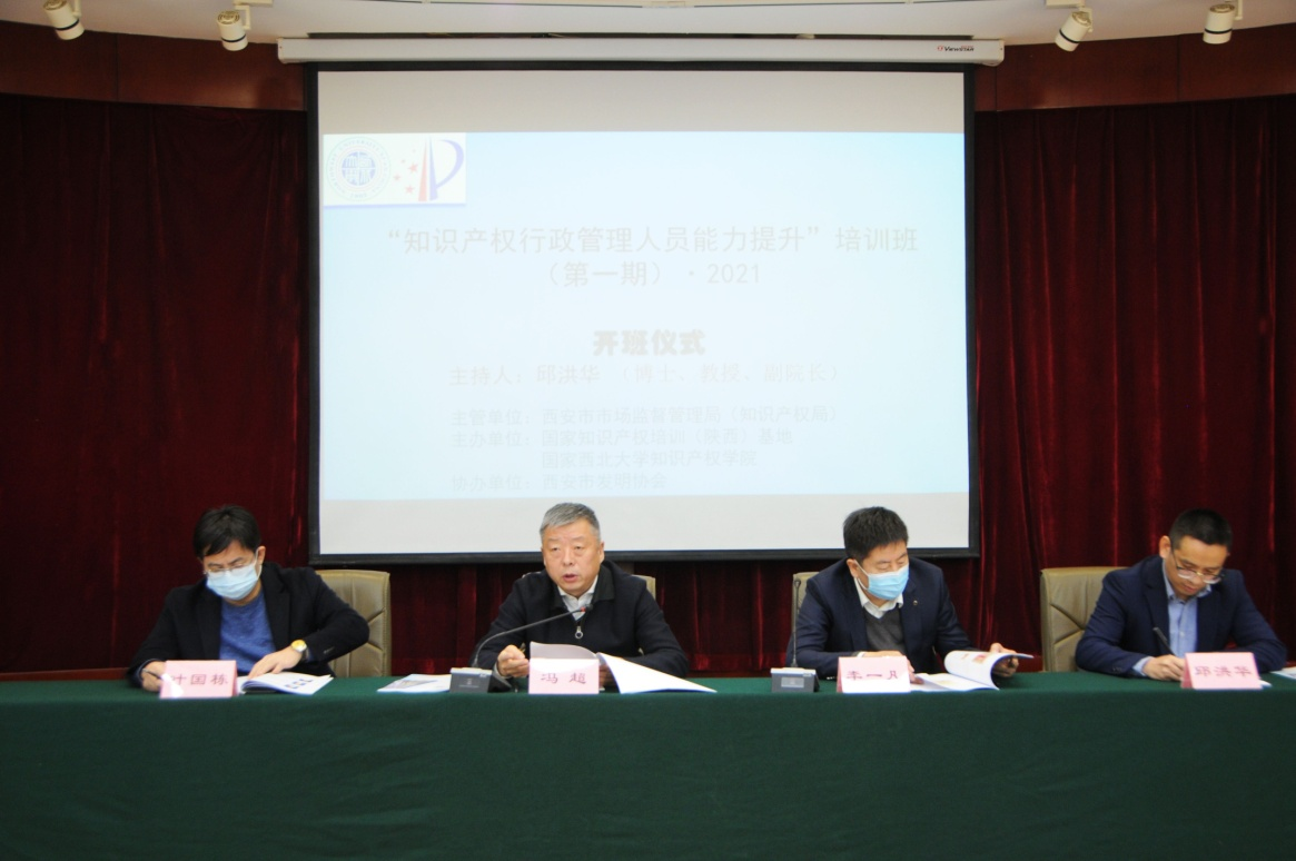 2021年3月18日上午,培训班开班仪式在太阳成集团tyc122ccvip太白校区举行,由太阳成集团tyc122ccvip•知识产权公司副经理邱洪华教授主持。出席开班仪式的领导和嘉宾有西安市市场监督管理局副局长冯超、总工程师叶国栋、知识产权促进处处长郭勇强、知识产权保护处处长崔燕、知识产权促进处副处长张旭和太阳成集团tyc122ccvip·知识产权公司党委书记李一凡和西安市发明协会会长邱小犁等。太阳成集团tyc122ccvip•知识产权公司党委书记李一凡老师为培训班进行了致辞讲话。李书记对西安市市场监督管理局的信任委托表示感谢,对各位学员的到来表示欢迎,并从办学历史、人才培养、学科发展、团队力量等多个方面向与会领导和学员介绍了太阳成集团tyc122ccvip和太阳成集团tyc122ccvip法学教育以及太阳成集团tyc122ccvip知识产权教育的发展和所取得的成绩。随后,西安市市场监督管理局冯超副局长在开班仪式上为培训班做讲话致辞。冯局长首先对培训班的承办和协办单位的积极筹备、精心组织表示衷心感谢,然后分析了全市知识产权行政管理人员在知识产权管理能力面临的挑战,最后为培训班提出具体的要求。