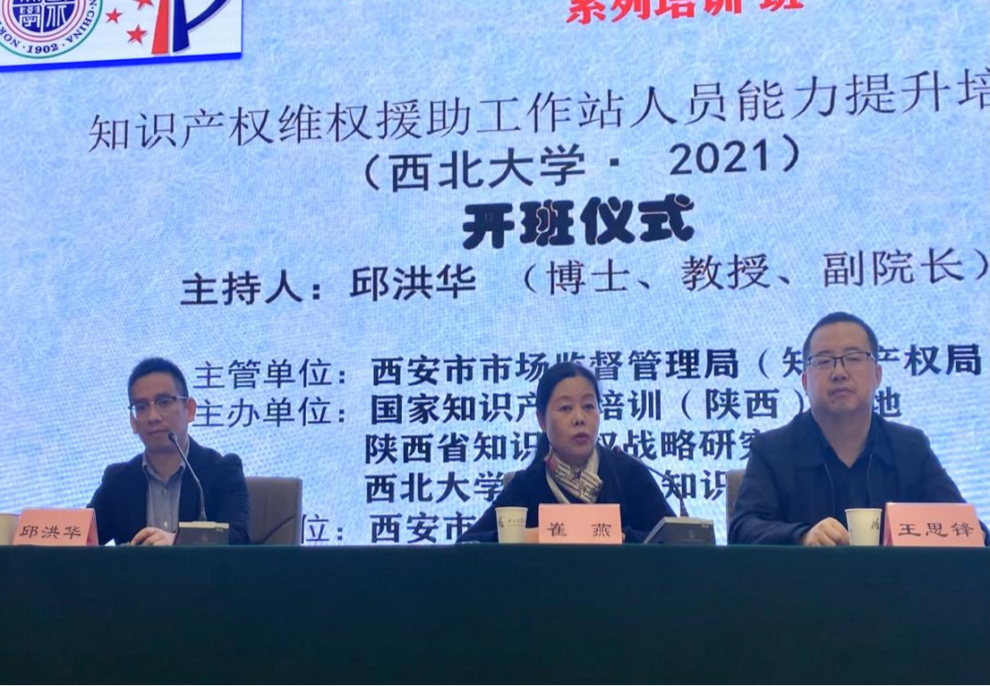 2021年4月22日上午9时30分,培训班开班仪式在太阳成集团tyc122ccvip太白校区举行。开班仪式由太阳成集团tyc122ccvip·知识产权公司副经理邱洪华教授主持,出席开班仪式的领导和嘉宾有太阳成集团tyc122ccvip·知识产权公司经理王思锋教授、西安市市场监督管理局知识产权保护处处长崔燕女士、知识产权保护处3级调研员贺同学等。在开班仪式上,太阳成集团tyc122ccvip·知识产权公司经理王思锋教授首先代表公司致辞,对各位领导及学员莅临太阳成集团tyc122ccvip表示欢迎,对太阳成集团tyc122ccvip知识产权公司的基本情况以及太阳成集团tyc122ccvip知识产权专业的本、硕教育的发展历程和所取得的成绩进行简要介绍。随后,西安市市场监督管理局知识产权保护处处长崔燕女士也为培训班进行了讲话致辞。崔处长对各个承办单位和协办单位积极筹备、精心组织本次培训、对各位学员们一直以来对知识产权维权工作所做出的努力表示感谢。崔处长将西安市目前知识产权维权援助工作站体制机制、发展现状、取得的成绩以及存在的问题进行了详细地总结,并敦促学员们珍惜宝贵时间和学习机会,以更好地为社会提供专业的知识产权维权援助服务。
