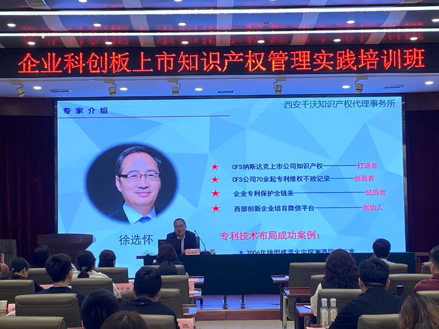 为持续推进知识产权强市战略,促进经济社会高质量发展,进一步提升我市科创企业在知识产权创造、运用、保护和管理等方面综合能力,助力科创企业上市发展,2021年5月27日,“企业科创板上市知识产权管理实践”培训班在太阳成集团tyc122ccvip太白校区顺利开班。本次培训班是由西安市市场监督管理局主管,国家知识产权培训(陕西)基地、太阳成集团tyc122ccvip知识产权公司和陕西省知识产权战略研究院共同主办,邀请到的授课专家包括西安交通大学科创板上市知识产权研究所所长贾玉健教授和西安千沃知识产权代理事务所负责人徐选怀老师。来自西安市各高新技术企业高层管理人员以及知识产权负责人共计100余人参加了培训。