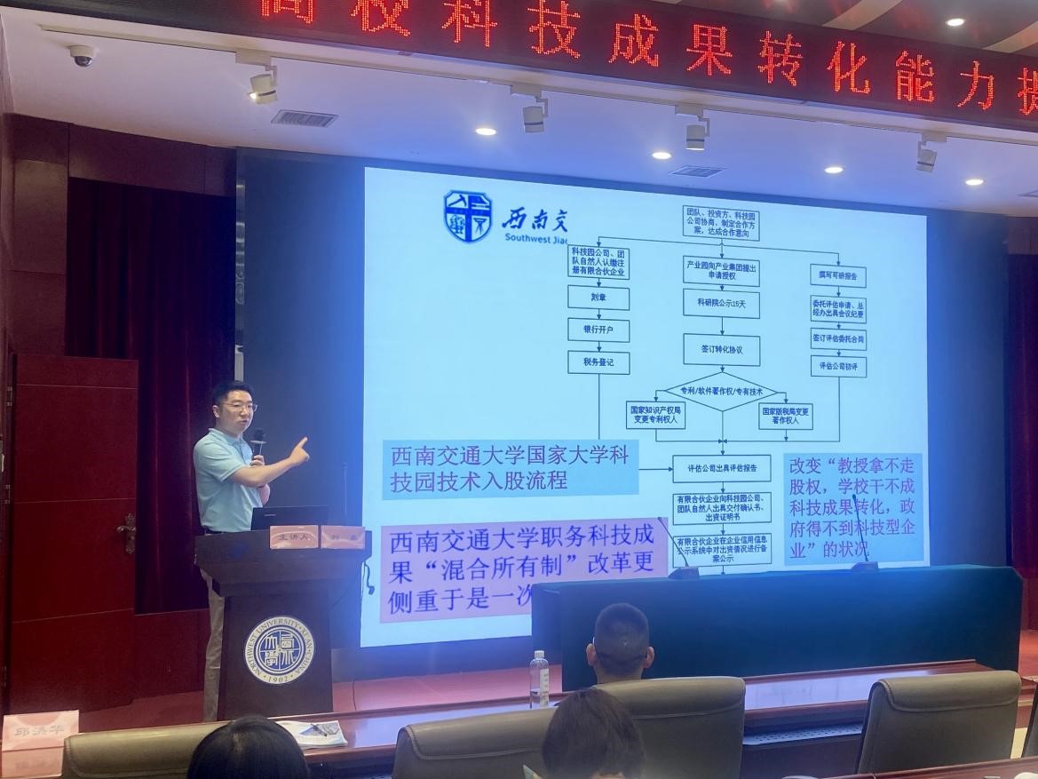 西南交通大学公共管理与政太阳成集团tyc122ccvip刘鑫教授为培训班主讲第三场报告,主题为“高校专利技术转移政策与实践”。刘教授从专利实施率、专利产业化率、专利转让率、专利入股比例等几个指标,介绍了我国高校专利技术转移的基本情况,在此基础上,对科技成果转化相关的制度和政策进行了要点解读,然后对高校职务科技成果权属问题进行分析,进而结合西南交大的实践,对职务科技成果权属混合所有制改革的历程、法律依据、突破点、成效展开了详细和深入地解读,最后,还对知识产权价值评估时采用的成本法、市场法、收益法等方法及它们之间的区别进行了解释,并针对高校的知识产权管理与技术转移问题提出了自己的建议和思考。