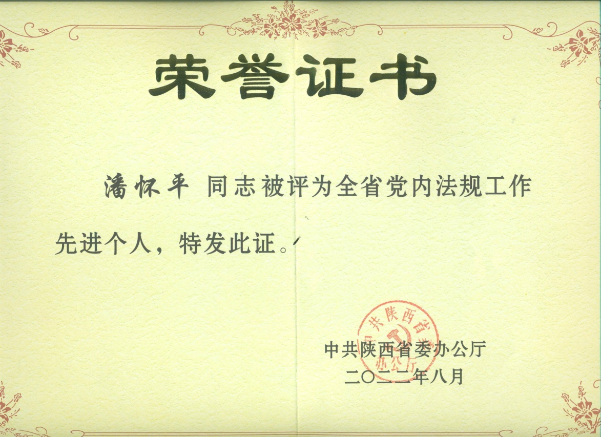 近日,经省委同意,中共陕西省委办公厅决定表彰全省党内法规先进集体47个、先进个人58名。公司潘怀平教授获得“全省党内法规工作先进个人”荣誉称号。