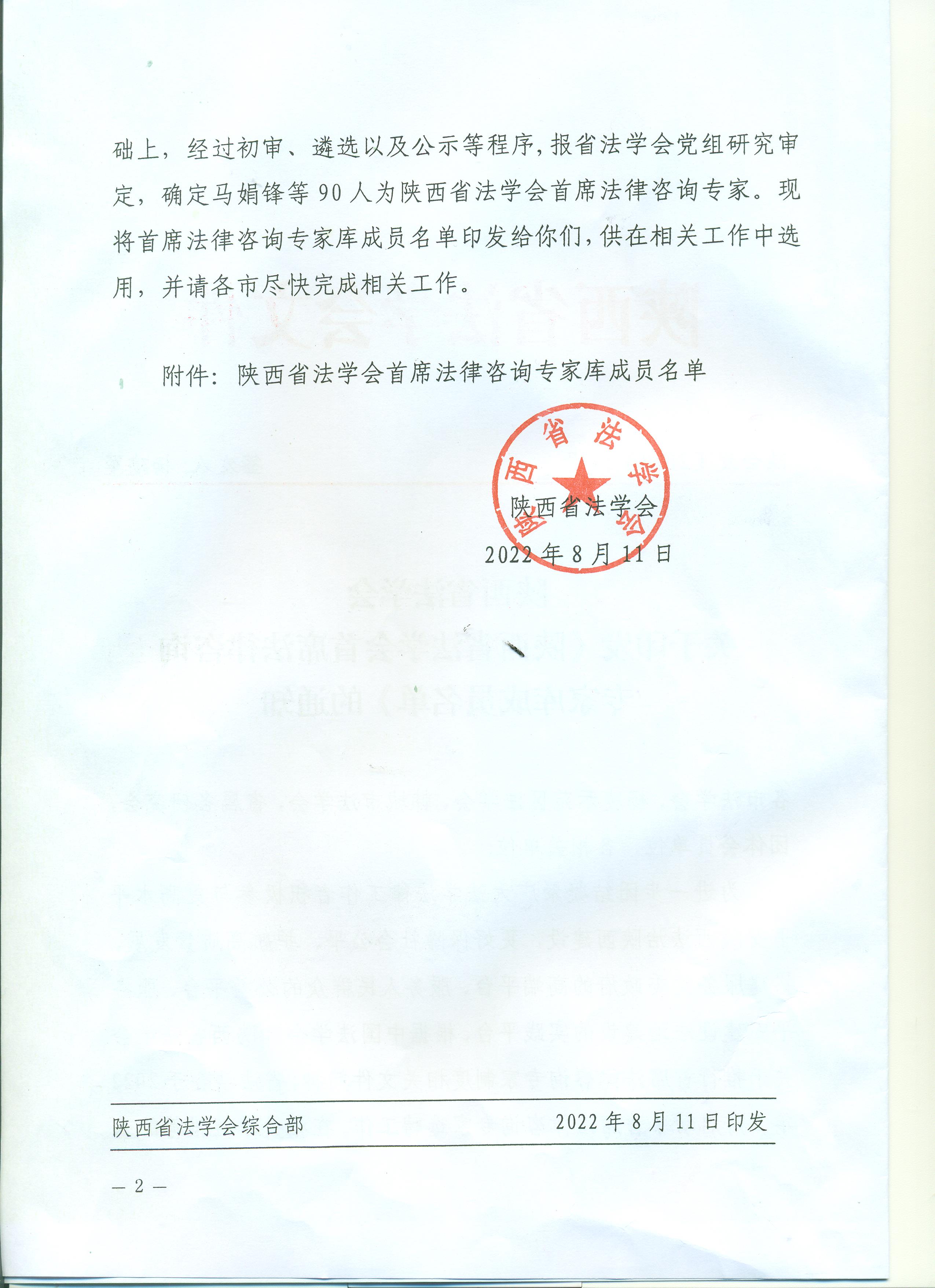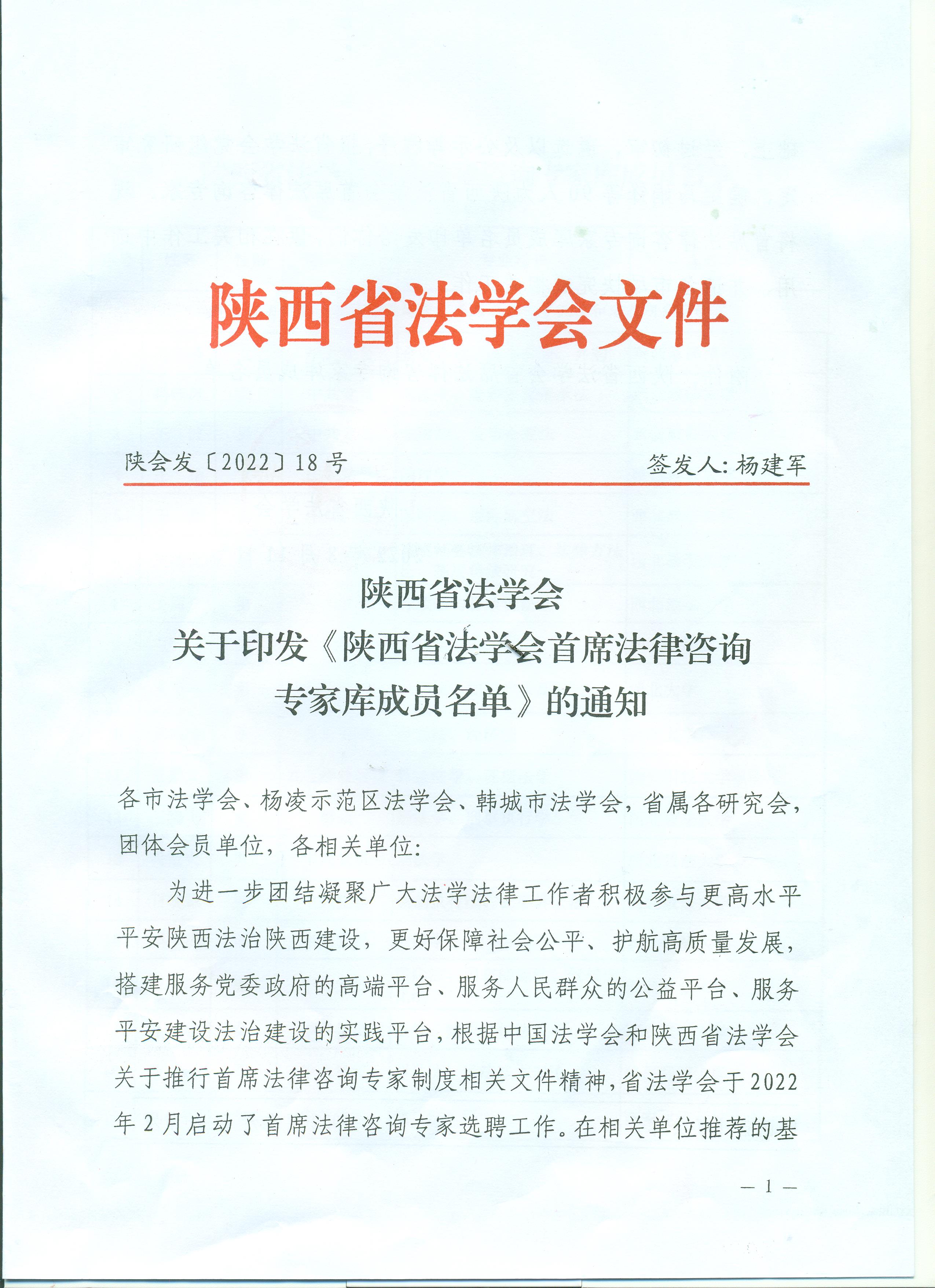 为进一步团结凝聚广大法学法律工作者积极参与更高水平平安陕西法治陕西建设,更好保障社会公平、护航高质量发展。根据中国法学会、陕西省法学会关于推行首席法律咨询专家制度相关文件精神,陕西省法学会选聘首批首席法律咨询专家库。在本次选聘工作中,我院王思锋教授、刘丹冰教授、王鸿貌教授、杨丽珍教授、张炜达教授、潘怀平教授、刘蕾教授,郑辉副教授、刘建仓副教授等9位老师被聘为陕西省法学会首席法律咨询专家。