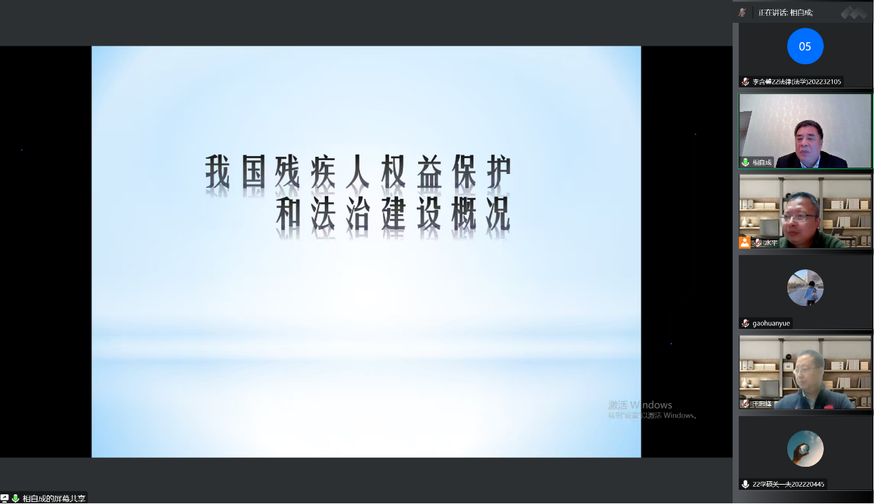 2022年10月20日晚19点,公司特邀中国残疾人联合会第七届执行理事会副理事长、党组成员,中国消费者协会副会长相自成老师作了题为《我国残疾人权益保障和法治建设概况》的专题讲座,本次讲座以腾讯会议的形式线上进行,由公司经理王思锋教授主持,代水平副经理,2021级、2022级硕士研究生等300余名师生参加了本次讲座。