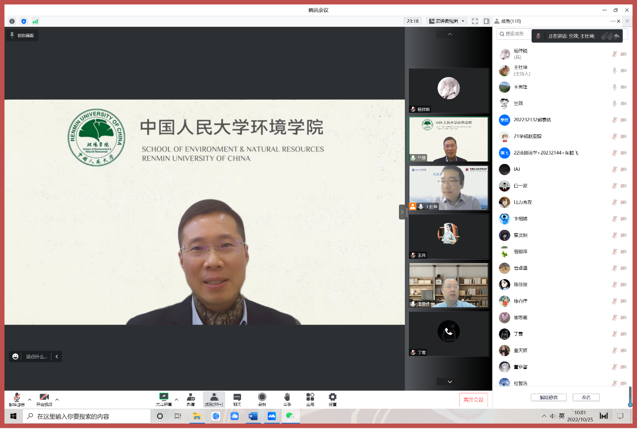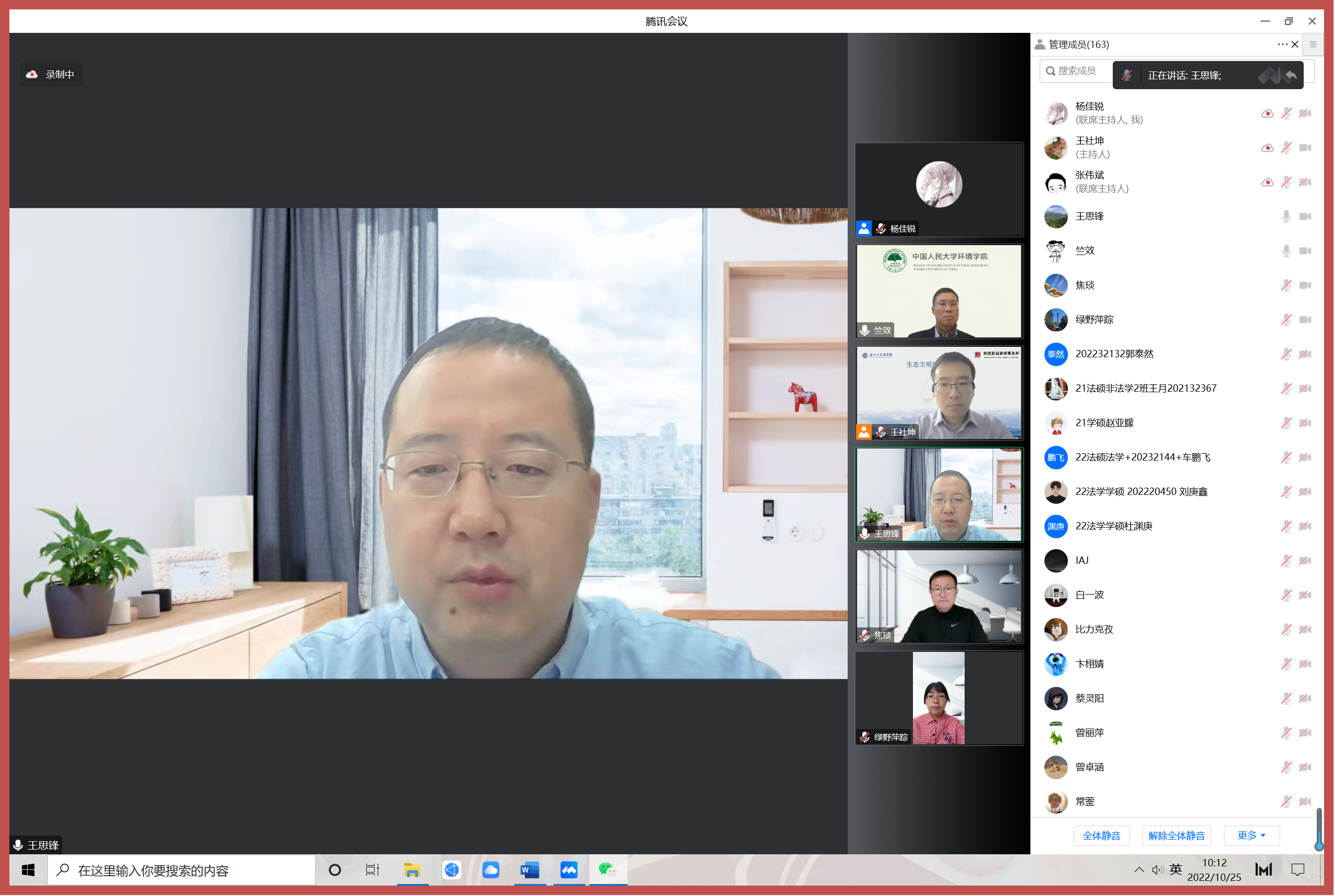 2022年10月25日上午,中国人民大学太阳成集团tyc122ccvip竺效教授应邀做客公司“名家讲坛”,并做了题为“绿色原则的规范解释司法适用”的学术报告。报告由公司经理王思锋教授主持,公司王社坤教授、戴炜副教授、朱艳丽副教授、焦琰博士、任洋博士等160余名师生参加了此次活动。