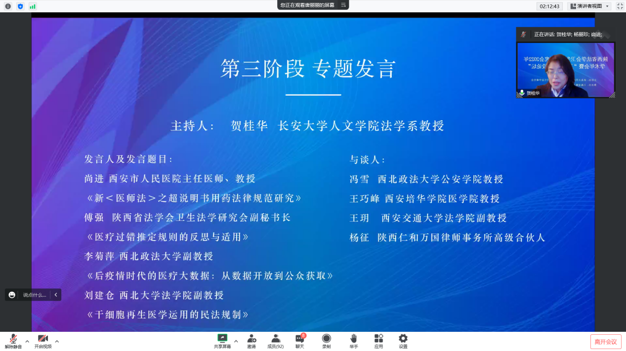 大会专题发言阶段,由陕西省法学会卫生法学研究会副会长、长安大学人文公司法学系贺桂华教授主持。