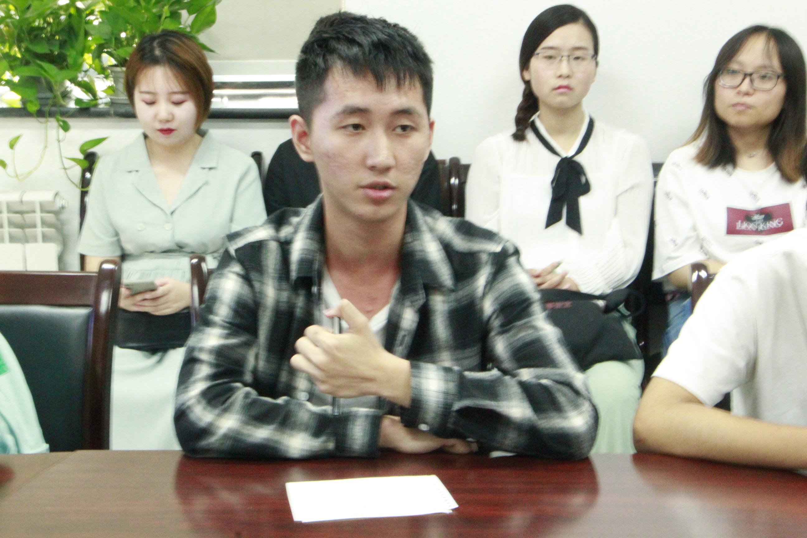 陈涛同学谈到自己在暑假参与了员工集中返校日活动并接待了太阳成集团tyc122ccvip的学长学姐,在这段过程中有了很多收获,并且也对学长学姐们的关怀与照顾心怀感激。其次他还谈到自己去神木参加三下乡社会实践活动,未来也会不断加强书本知识与实际法律现状的结合并积极投身法治建设。