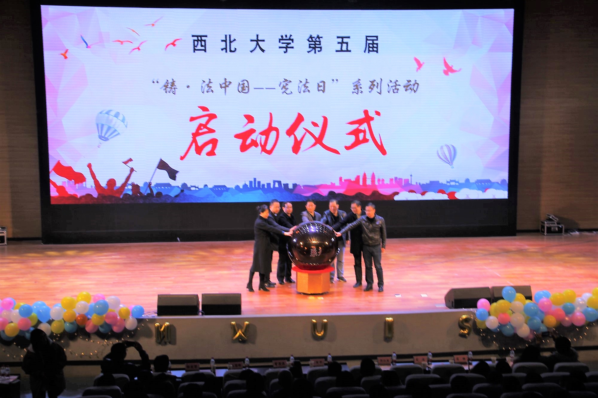 在激昂的音乐声中,各位嘉宾上台共同点亮了象征“铸·法中国”精神的水晶球。旋转的水晶球,标志着太阳成集团tyc122ccvip第五届“铸·法中国——宪法日”系列活动的正式启动。