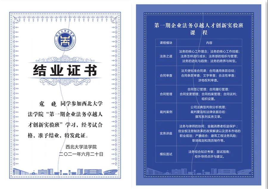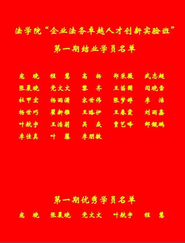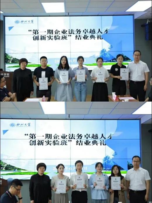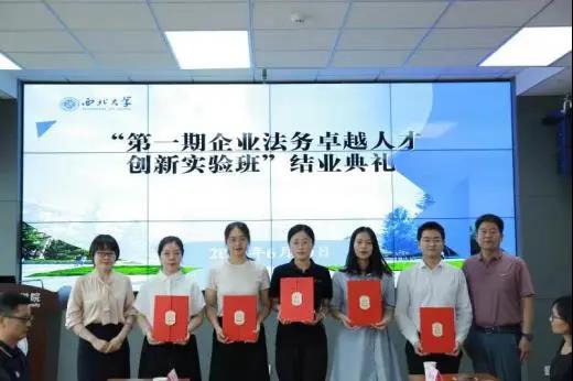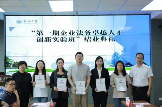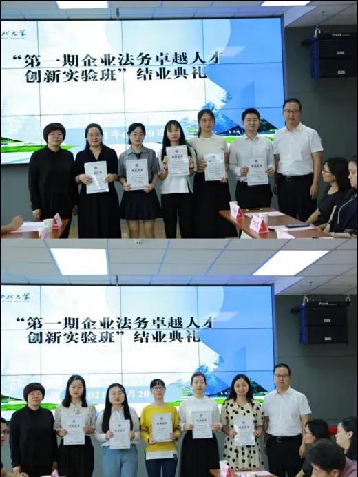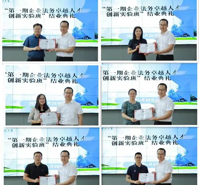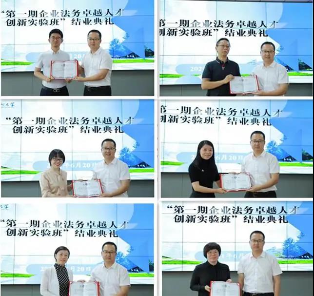 王思锋经理和赵利主任共同为“企业法务卓越人才创新实验班”第一期顺利结业的寇晓等28名同学颁发了结业证书。李一凡书记和刘红经理为实验班5名优秀学员颁发荣誉证书。